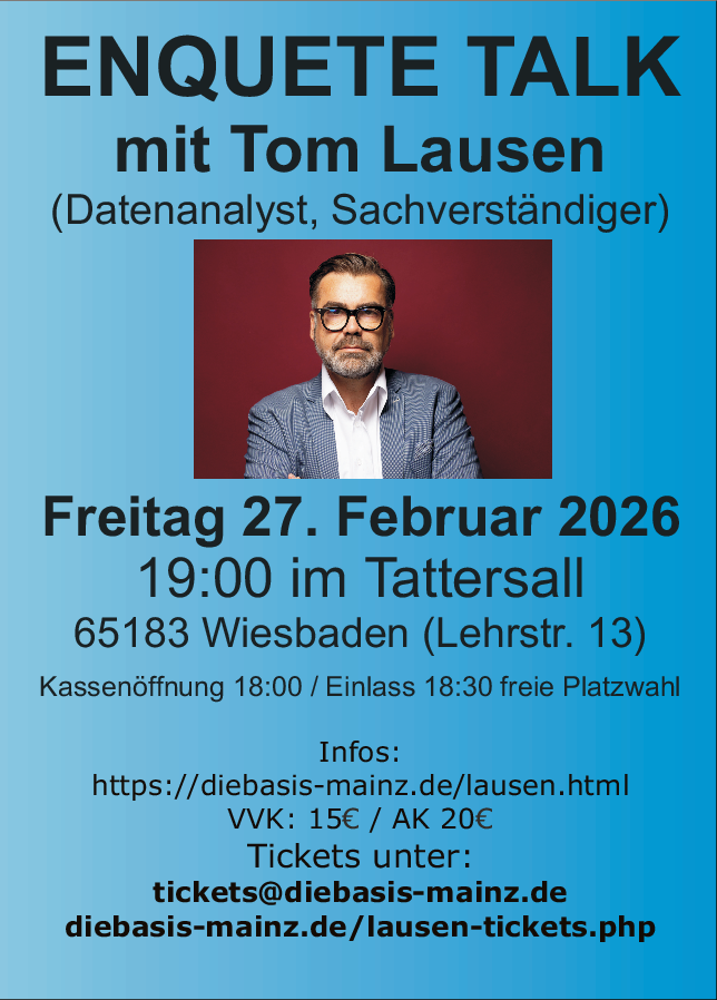 7. Januar 2026 von Liberto Maschke ENQUETE TALK mit Tom Lausen ENQUETE TALK mit Tom Lausen 19:00 27. Februar 2026 https://diebasis-mainz.de/lausen.html Wiesbaden, TattersallVeranstaltungsort anschauen iCal Google Kalender Kompletten Kalender ansehen